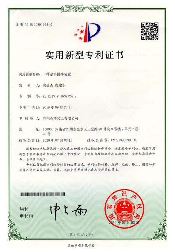 導讀:科技創(chuàng)新,推動社會發(fā)展,森塔在前進!鄭州森塔化工有限公司同時榮獲:一種涂料攪拌裝置,**證書號第:1···